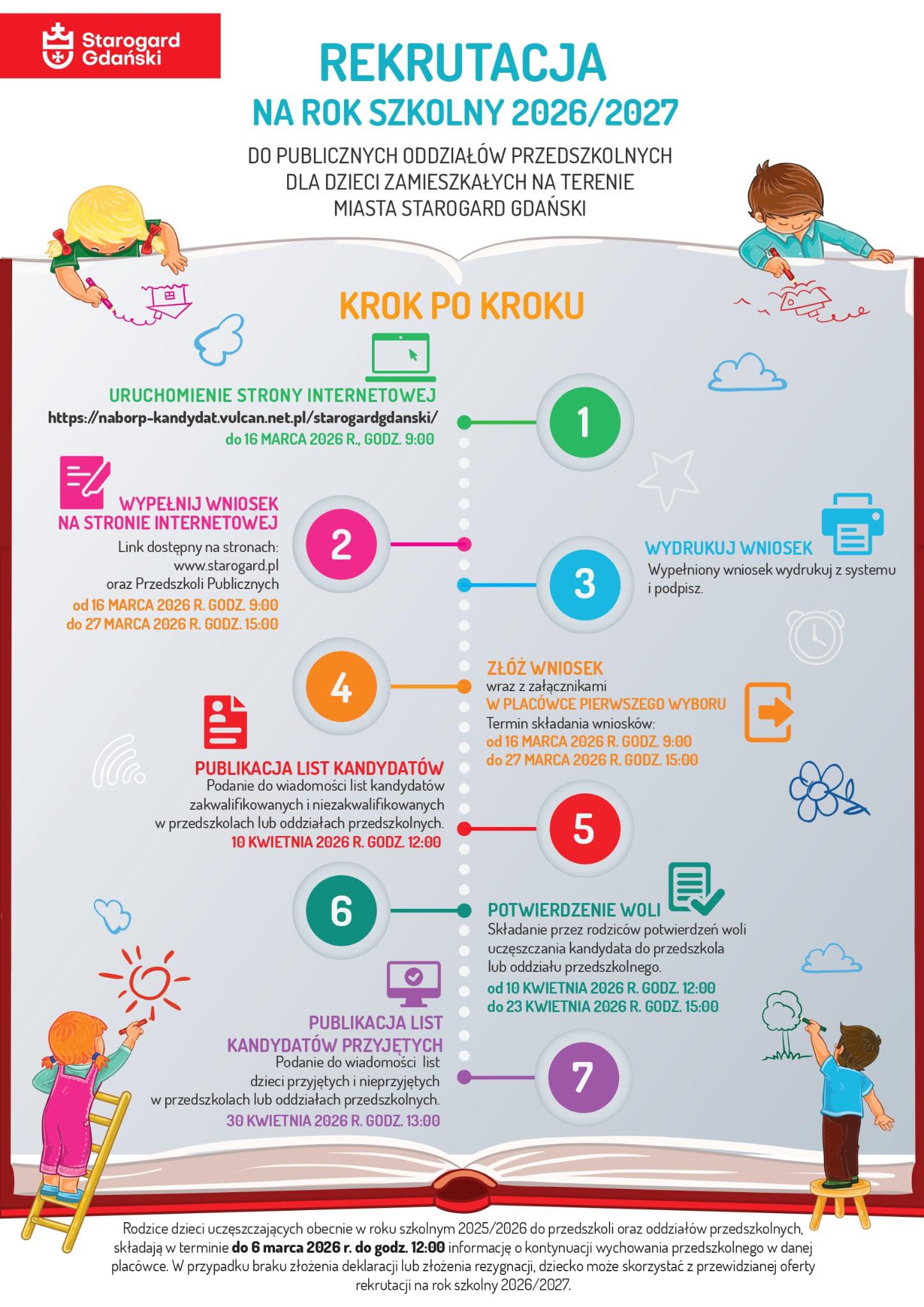 Rekrutacja dzieci do przedszkoli zostanie przeprowadzona w dniach od 16.03.2026 roku od godziny 9:00 do 27.03.2026 roku do godziny 15:00 przy wsparciu systemu elektronicznego dostępnego na stronie: